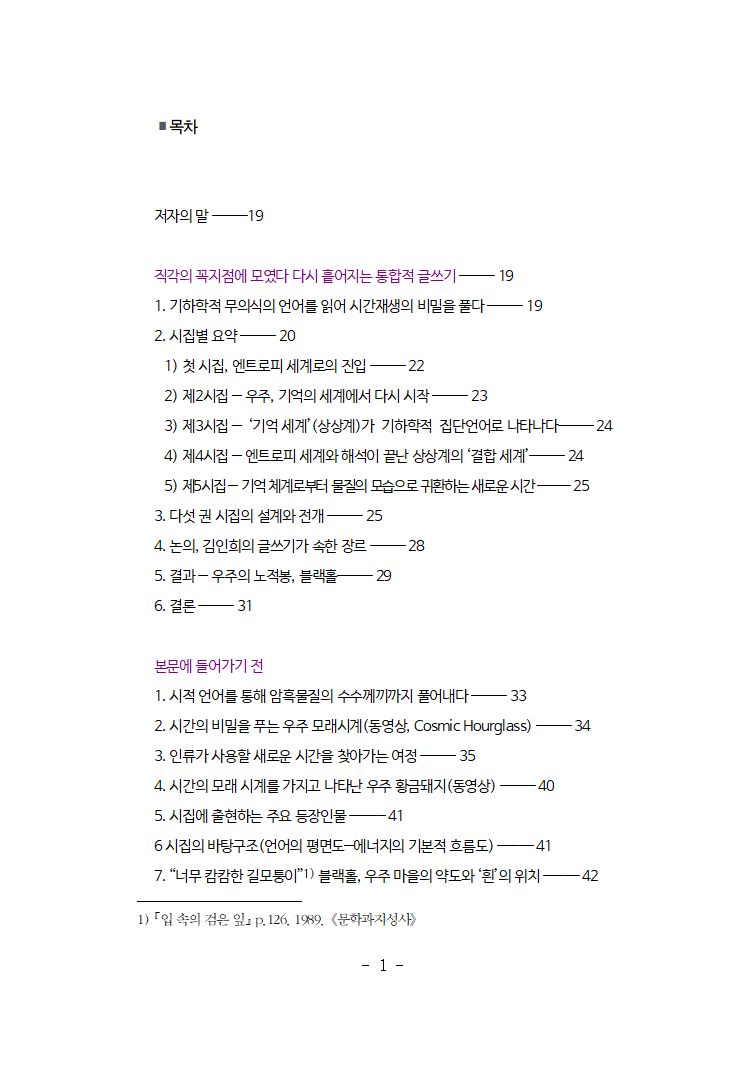 이 작품이 왜 ‘지금’ 필요한가?: ‘기후 위기와 인공지능의 시대에 김인희의 시가 제공하는 사회적 의미’와 공허한 시대에 우주와 대화하는 방식’을 안내받을 수 있다. ‘10여 개의 학문을 열역학과 기하학으로 통합한 신의 학문’이며 ‘과학과 문학의 경계를 지우고, 시간과 공간의 경계를 지운 문학’이다.